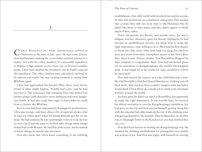 Photos had been supplied for each part opener, fortunately, and for once they were actually large, high res, and gorgeous. So I ran them full-bleed, with more jacket-rip-off-style text on the facing page. At this point, my boss vetoed the Sabon and asked the client what typeface had been used on the cover, so I could match it (Requiem). I wasn’t thrilled about mixing two serifs on the same page, but what the hell—I was trying not to get too invested in the design anyway, since I was sure it would get BOGSATed all to hell.